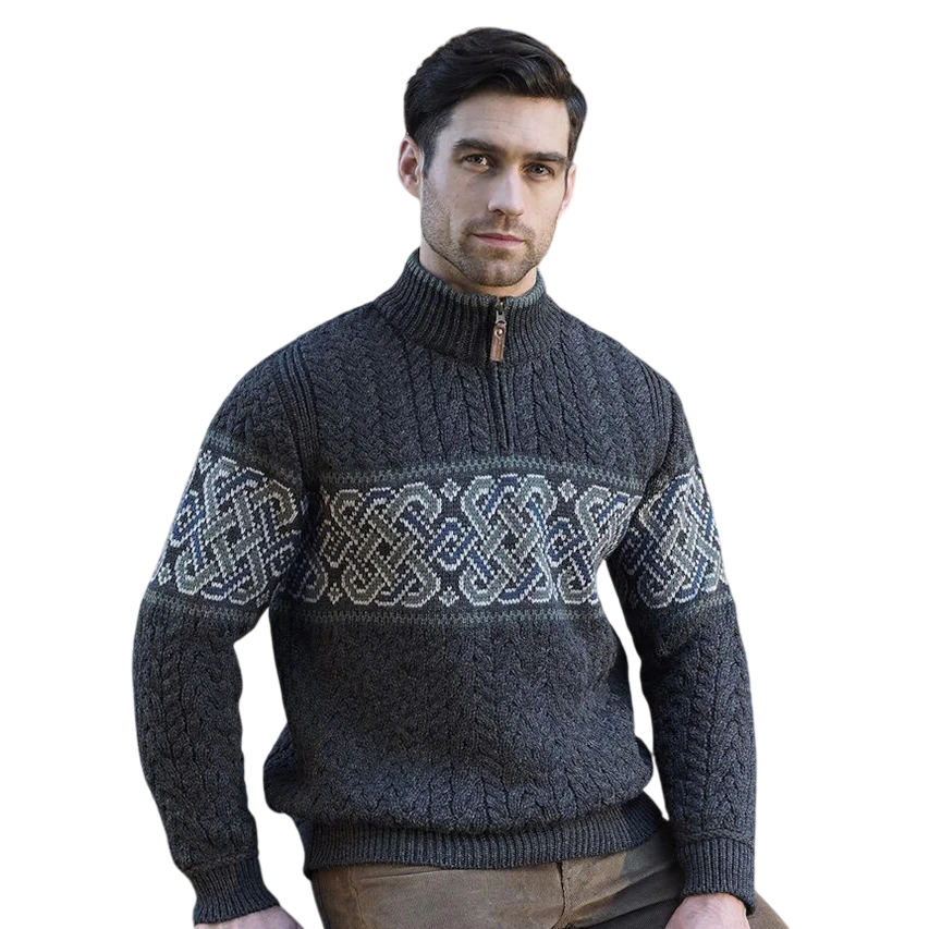 Men's Half Zip Aran Jacquard Charcoal Celtic Sweater