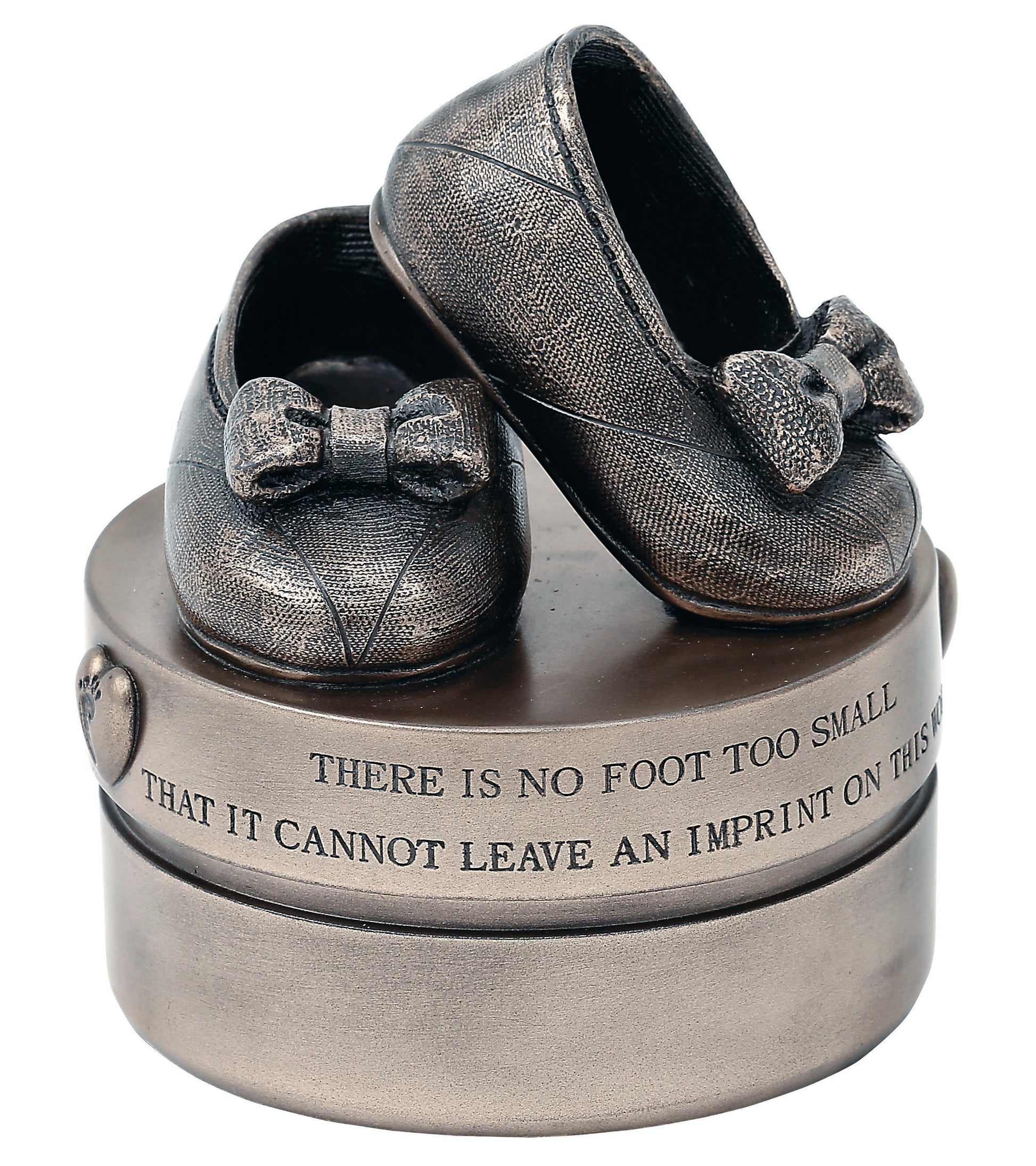 Shaped like a delicate pair of baby booties, this intricately detailed sculpture opens to reveal a hidden trinket box, perfect for storing tiny treasures like a first curl, bracelet, or small mementos. The soft bronze finish and graceful design make it a lovely addition to any nursery, dresser, or keepsake collection.