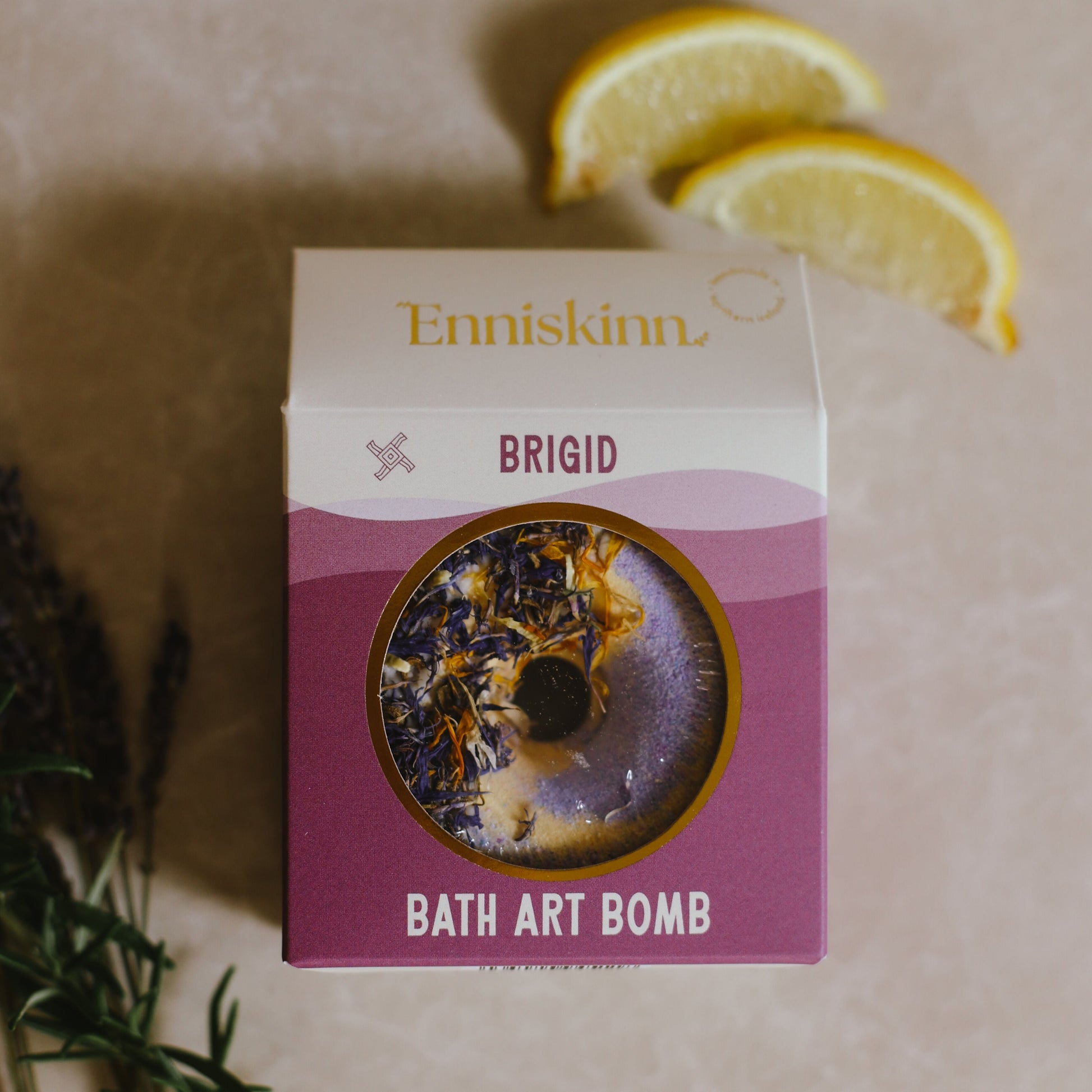An Ode to Brigid. Where true strength lies in kindness and true wisdom in humility. This handmade bath art bomb is scented with 100% essential oil blends and enriched with skin-nourishing apricot kernel oil and cocoa butter with flavor scents of lavender, lemon, and frankincense.