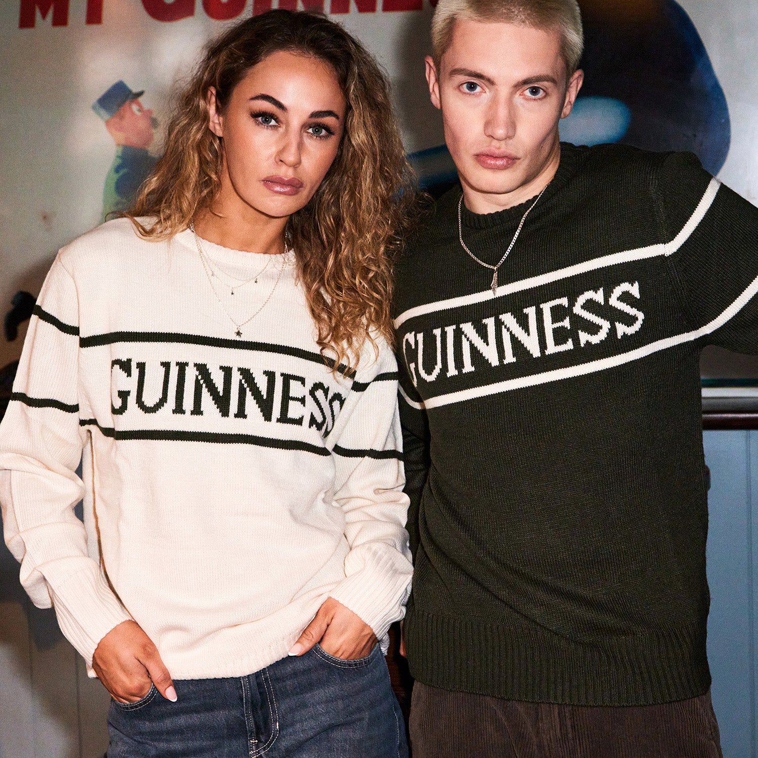 A warm bottle-green knit sweater featuring crisp white Guinness text. A comfortable and heritage-inspired layer for cooler days.