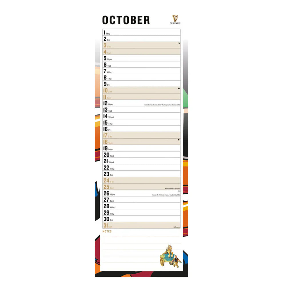 Our best-selling Guinness Slim Wall Calendar for 2026 is designed to fit perfectly into narrow spaces, making it both functional and stylish. Featuring a sleek list-style format with a fresh Guinness-themed image each month, it helps you stay organised while celebrating your favourite stout brand all year long. This compact and easy-to-use calendar is ideal for kitchens and home offices.