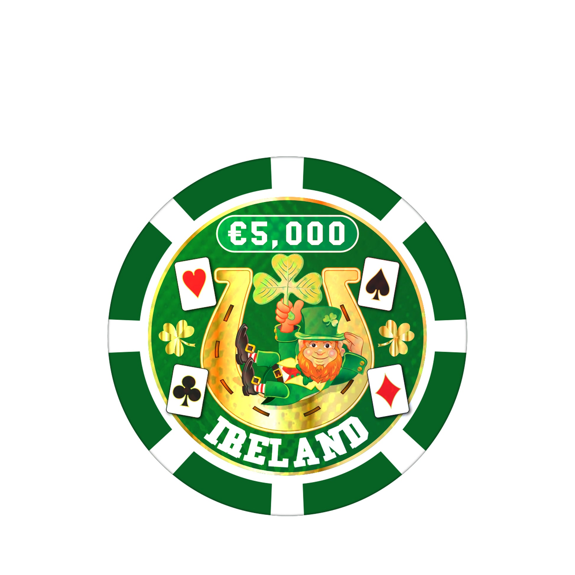 Add a touch of fun and Irish charm to your collection with this novelty Ireland 5000 Euro Casino Chip. Featuring a bold shamrock on a horse-shoe at the center, it's designed exclusively for Carroll's Irish Gifts and makes a unique keepsake or playful gift.