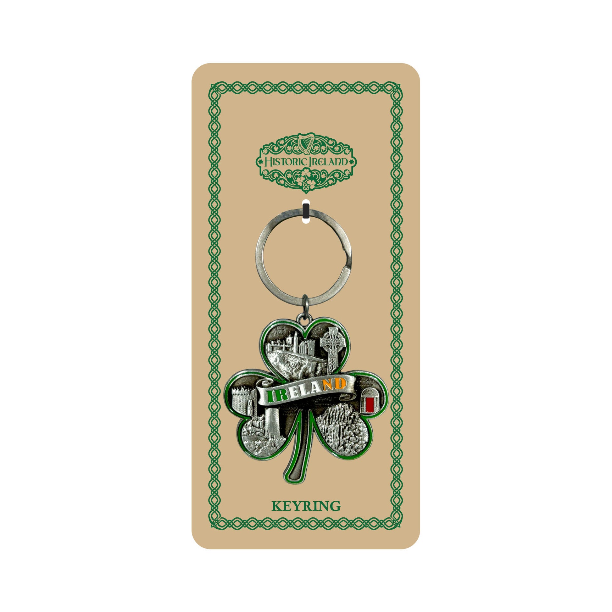 Carry a piece of Ireland wherever you go with this Ireland Shamrock Shaped Metal Keyring. Designed in the shape of the iconic shamrock, it features beautifully detailed Irish landmarks and “Ireland” written in the vibrant tricolor. A perfect blend of style and tradition, this keyring is a charming reminder of the Emerald Isle.