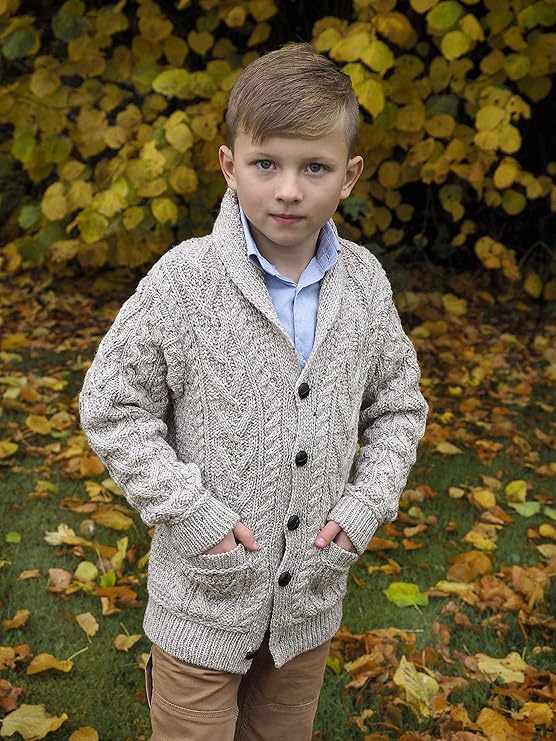 The Kid's Shawl Neck Aran Cardigan is made from 100% merino wool and is knitted using a variety of different traditional stitching patterns. With diamond and cable knitting patterns running side by side down the body, this Aran cable knit sweater is essential for all children, especially for the cold autumn and winter days.