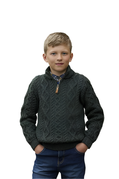 This Kid's Zip Neck Aran Sweater is made from 100% Merino wool, soft to the touch and comfortable to wear. With diamond and cable knitting patterns running side by side down the body, this Aran cable knit sweater is essential for all children, especially for the cold autumn and winter days.
