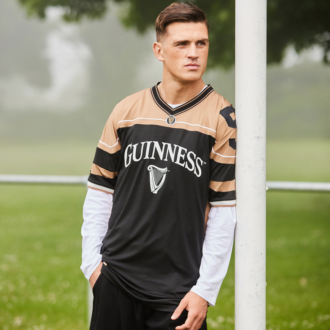 Show off your sporty side with the Men's Guinness Black and Gold American Football Top, inspired by classic jersey styles and infused with Guinness heritage. Made from a stretchable, lightweight fabric, this top offers maximum comfort and bold visual appeal. Perfect for casual wear, match days, or Guinness fans who love bold, athletic style with an Irish twist.