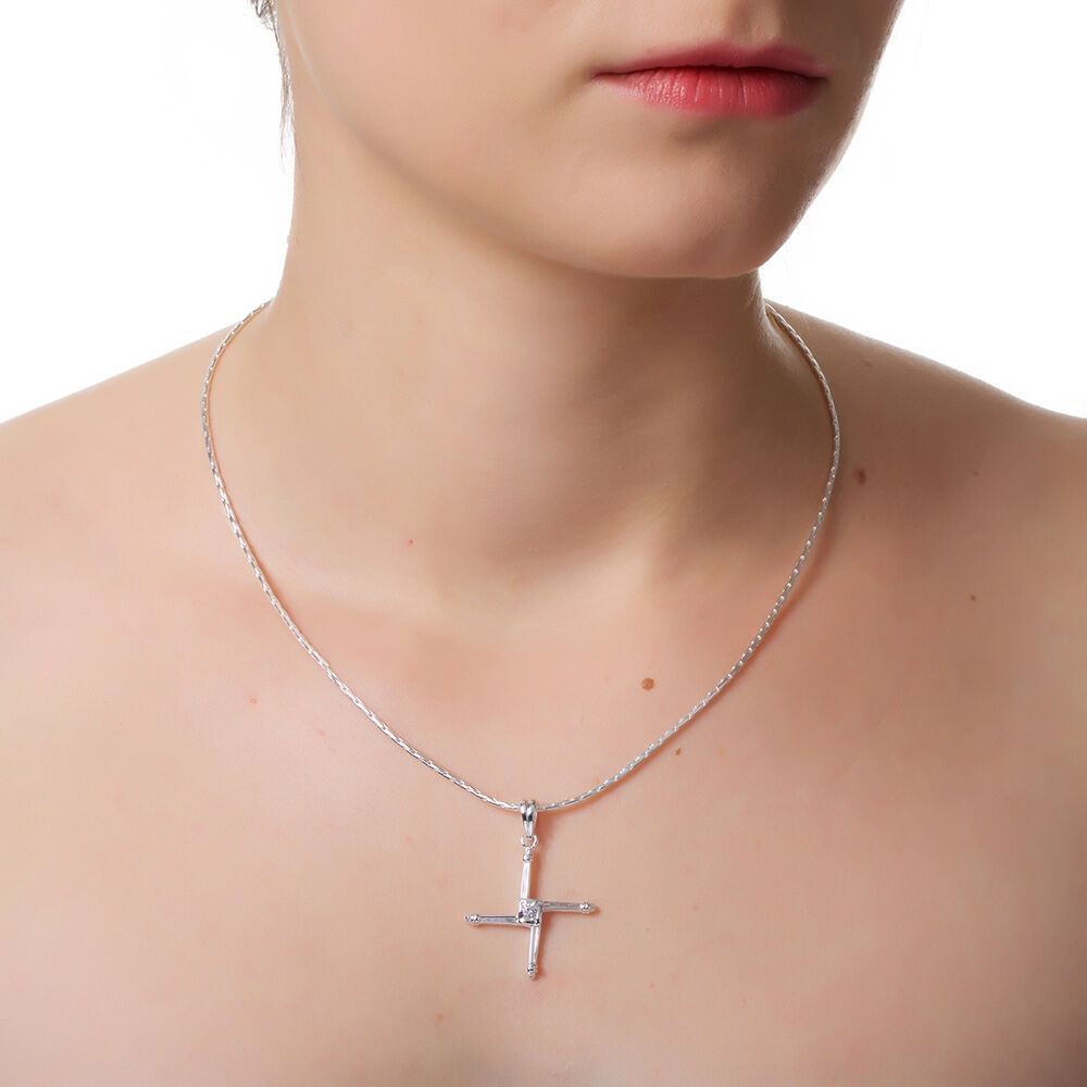 Silver plated St. Brigids Cross necklace with a protective anti tarnish layer single clear cubic zirconia stone setting presented in a Newbridge Silverware gift box. Product dimensions cross 25mm x 25mm chain length 400mm plus a 50mm extension.