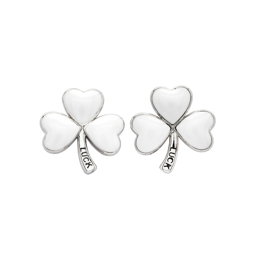 These stunning post-style earrings are crafted from base metal and plated in shiny platinum, featuring a stylish shamrock design with white enamel. The word "LUCK" is elegantly engraved along the stem, and the secure, easy-to-use backings ensure comfort and wearability all day.