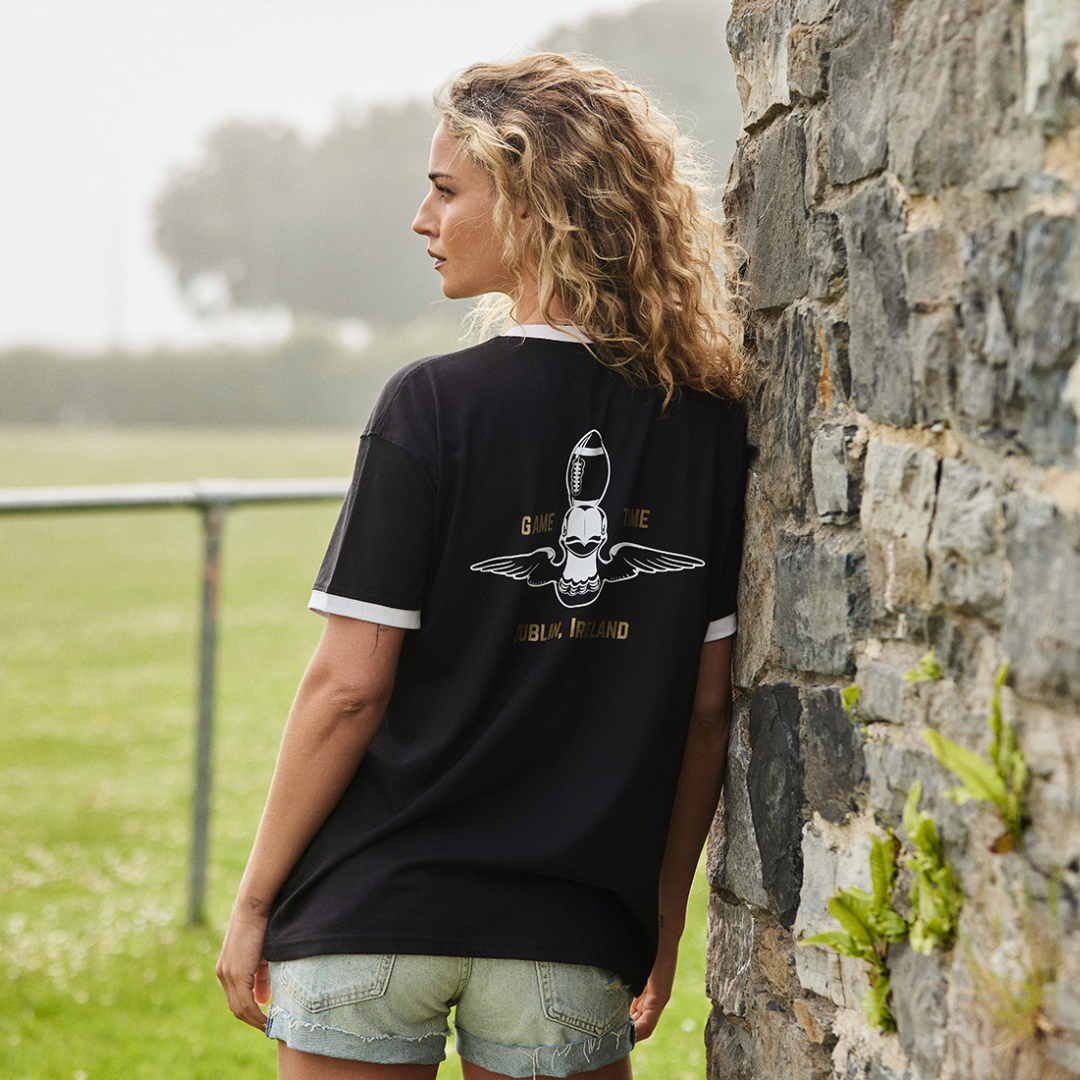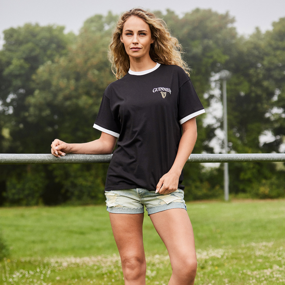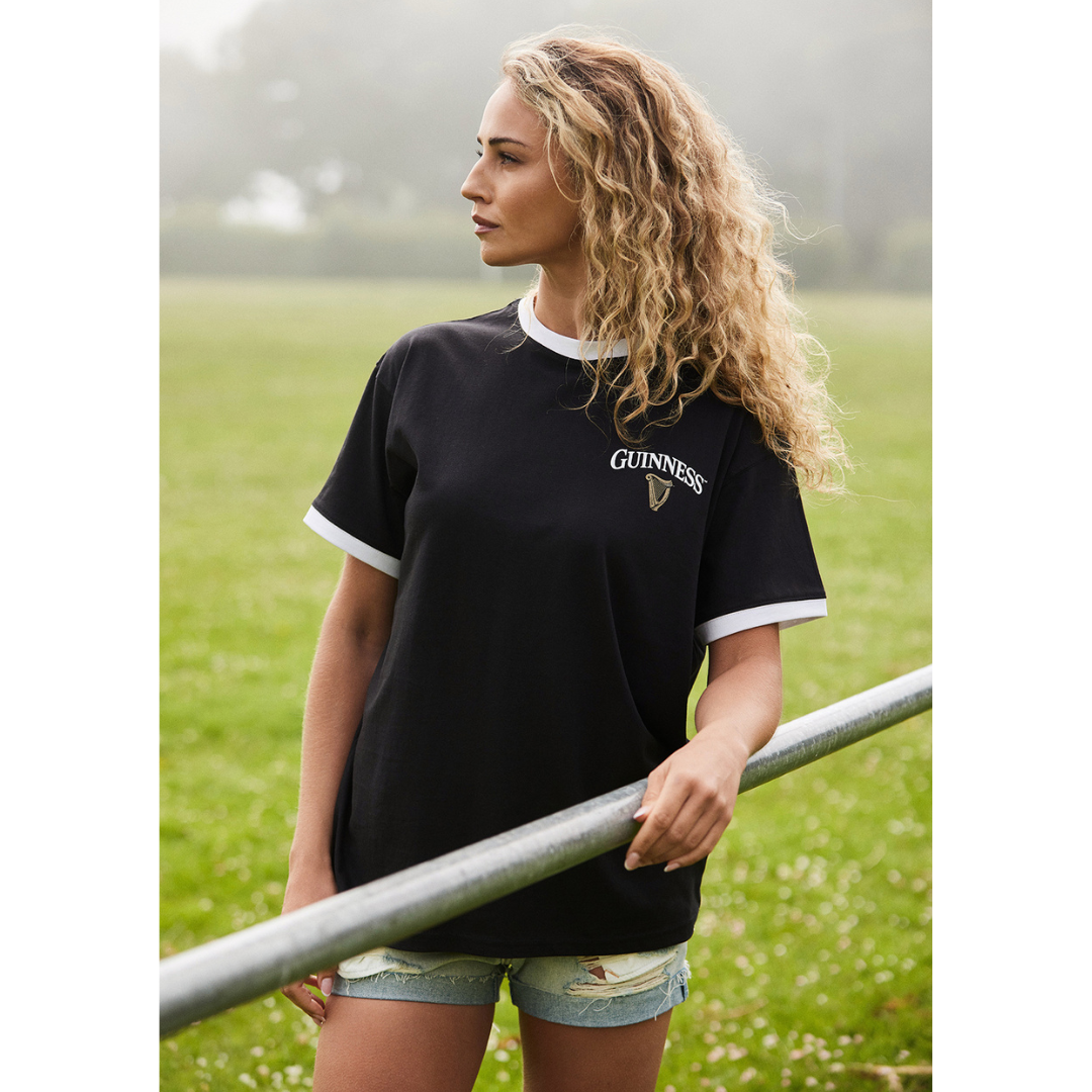 Get ready for game day in classic style with the Guinness Game Time Ringer T-Shirt. Crafted from 100% soft cotton knit, this black T-shirt features bold white piping on the collar and sleeves for a standout vintage look.